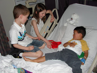 We got up bright and early (actually it's not bright at 5:15am) and arrived at the hospital to find that there was a bit of a scheduling mix-up. Joshua wasn't taken back into surgery until 9:30. So we sat in pre-op for a few hours trying not to remember that we could still be under the covers at home.